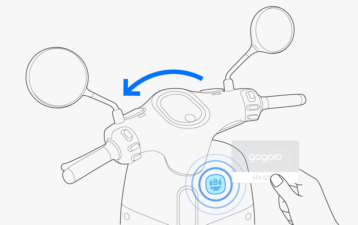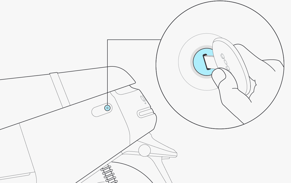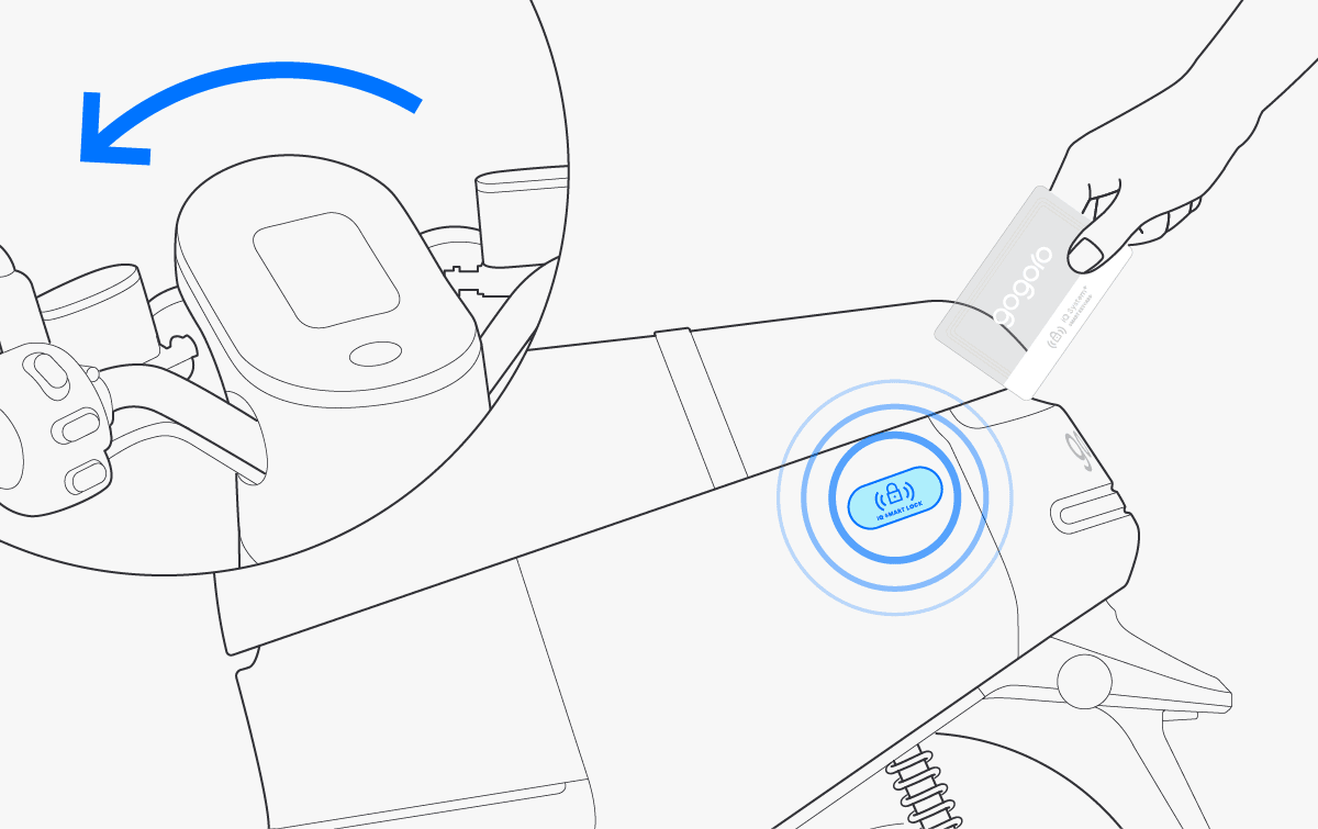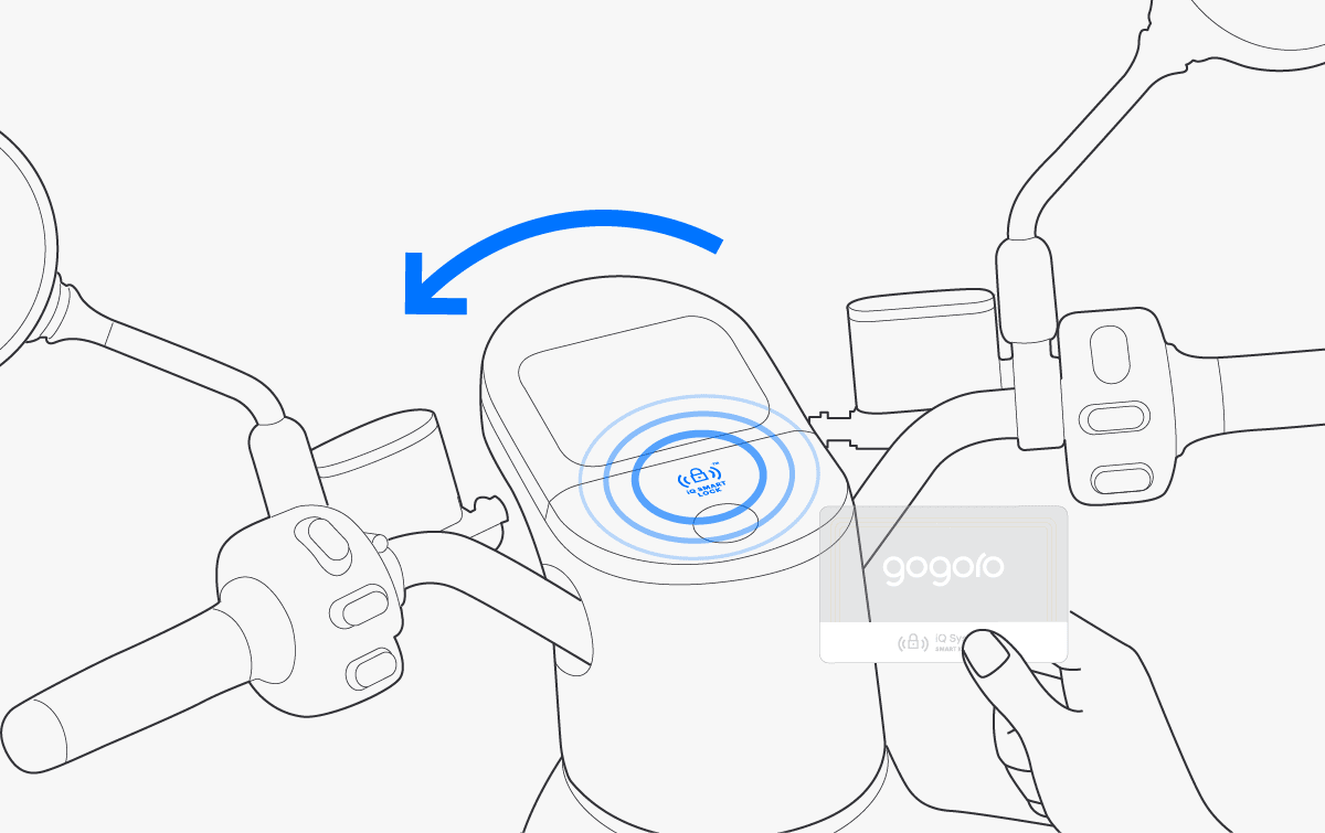請按住「座墊開啟鍵」不放, 再將卡片輕觸⾞上之感應區即可開啟車廂。- Gogoro 2 系列